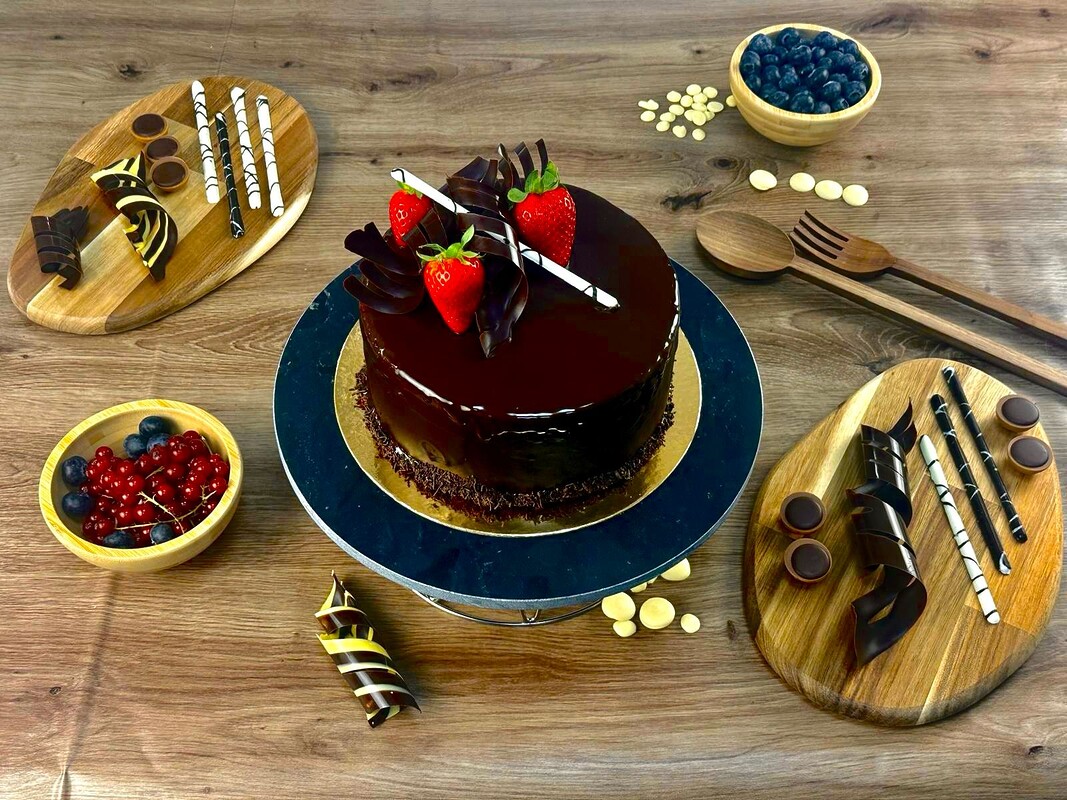 Totul este așezat pe un blat fin de cacao, iar decorul sofisticat din fulgi de ciocolată și fructe proaspete transformă acest tort într-un adevărat spectacol vizual.