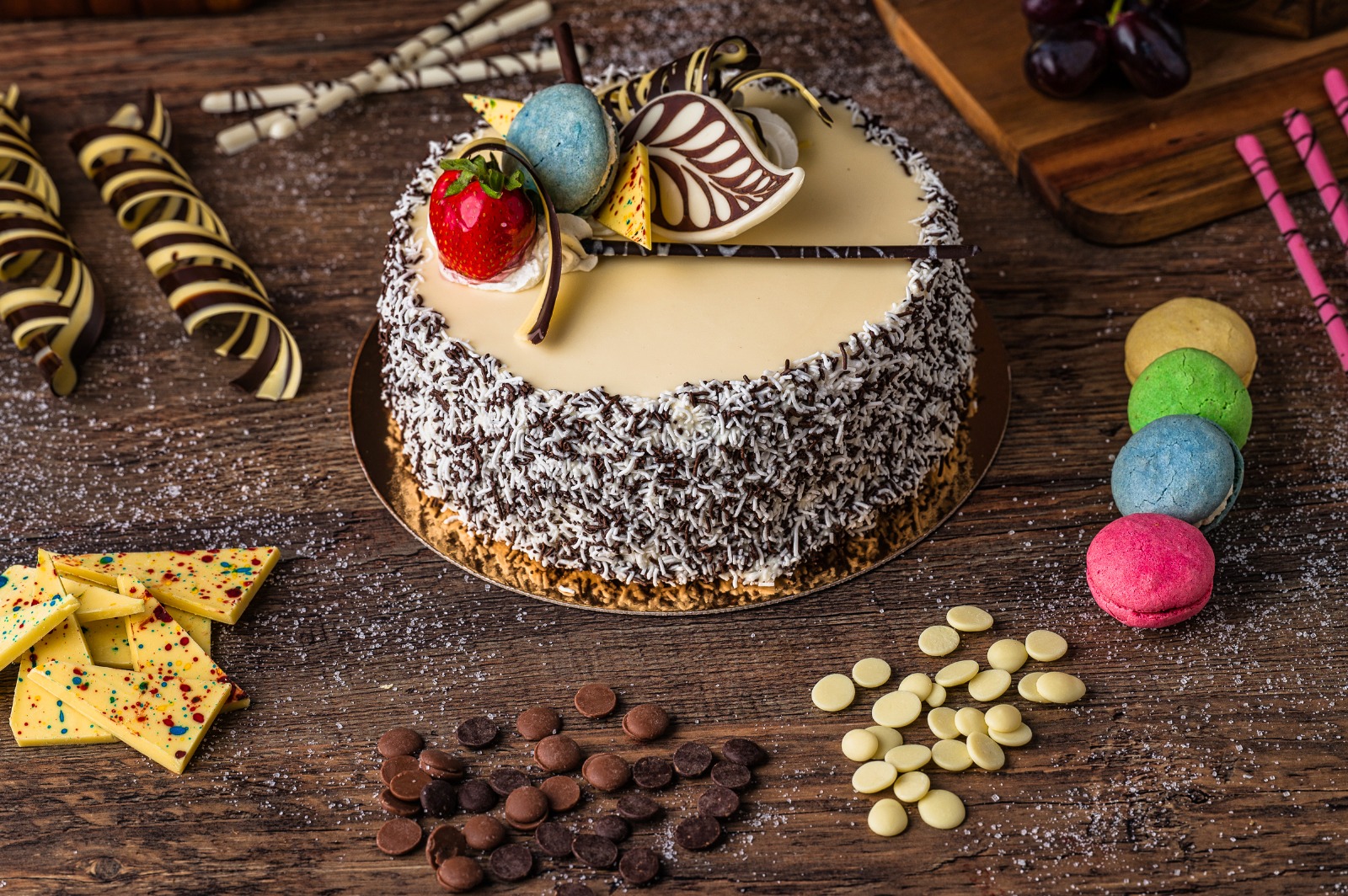 Ingrediente: CHOCOCREAM BIANCO (Zahar, uleiuri vegetale (floarea soarelui, palmier), lapte praf degresat, zer praf, lactoza, emulsifiant lecitina din soia, arome), Blat de cacao (Oua de gaina, faina alba de grau 650, ulei de floarea soarelui, bicarbonat de sodiu, zahar tos, cacao alcalinizata 10-12%, pasta de zmeura, blat alb de cacao, ciocolata alba, glazura de ciocolata alba, decoruri de ciocolata, capsuna, macarons.