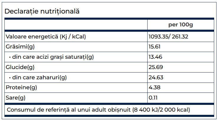 Ingrediente: Blat de cacao (Oua de gaina, faina alba de grau 650, ulei de floarea soarelui, bicarbonat de sodiu, Cacao pudra alcalinizata 10-12% grasime), Crema de mousse alba (cioclata MASTERCAO WHITE, lapte, crema vegetala, oua de gaina, zahar, gelatina de vita), piure de coacaze (coacaze rosii ,zahar), decor de ciocolata.